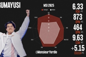 直播吧7月12日讯 2025MSI T1 vs AL败者组决赛赛前,外网数据博主更新Gumayusi选手本次MSI数据,KDA、分均伤害、分均经济、分均补刀、14分钟补刀领先均位居第一。
