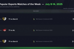 直播吧7月15日讯 外媒数据统计公布了2025年7月8日-14日热门比赛的观众峰值数据,前三名被T1战队包揽;