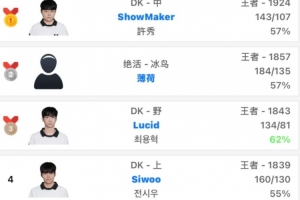 直播吧2月4日讯 DK人均排位乱杀👊ShowMaker登顶,打野Lucid第三、上单Siwoo第四。