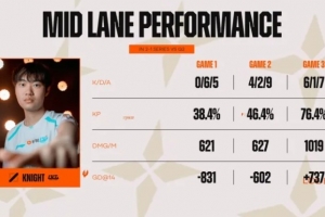 英文流分享一组数据,前三局比赛中knight在前两局前14分钟经济分别落后831和602,仅第三局前期领先。