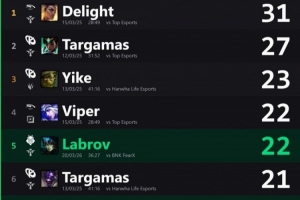 直播吧3月25日讯 外媒统计数据,先锋赛历史辅助选手单场比赛助攻数排行:Delight 31个第一。
