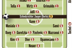 拜仁首发:诺伊尔(4分)、金玟哉(5分)、戴尔(5分)、乌帕(5分)、博伊(6分)、格雷茨卡(5分)、帕夫洛维奇(5分)、马兹拉维(5分)、穆西亚拉(5分)、萨内(5分)、凯恩(6分)