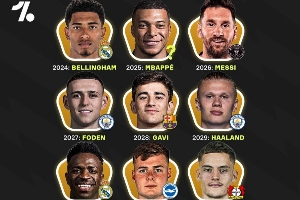直播吧05月29日讯 据OneFootball询问了AI有关未来15年的金球奖得主时,AI预测2026年梅西再夺金球奖。