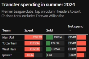 直播吧08月19日讯 天空体育今日盘点了英超各支球队截止目前的转会净支出排行,曼联、热刺居首。