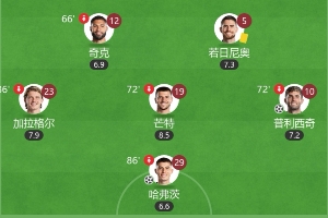 上半场补时阶段,芒特右路传中,哈弗茨头球吊射破门。