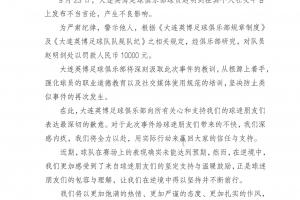 在此,大连英博足球俱乐部向所有关心和支持我们的球迷朋友们表达最深切的歉意。对于此次事件给球迷朋友们带来的不快,我们深感内疚,我们将全力以赴,用实际行动来赢回大家的信任与支持。