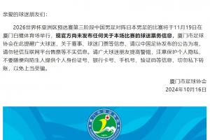 2026世界杯亚洲区预选赛第三阶段中国男足对阵日本男足的比赛将于11月19日在厦门白鹭体育场举行,现官方尚未发布任何关于本场比赛的球迷票务信息,厦门市足球协会在此提醒广大球迷,关于赛事、球迷门票等信息,请以中国足协发布的公告为准,请勿轻信互联网平台售票等不实信息。请广大球迷朋友提高警惕,注意保护个人隐私,不要随便向陌生人提供个人身份证号、银行卡号、手机号、验证码等信息,切勿私下转账,以免上当受骗。
