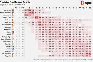 毕尔巴鄂——夺冠0.4%、第二名2.8%、第三名13%、第四名61.6%、第五名14.9%、第六名4.8%