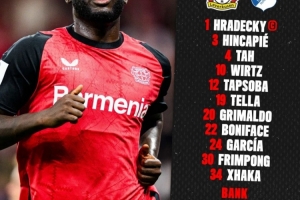勒沃库森首发:1-赫拉德茨基、3-因卡皮耶、4-若纳坦-塔、10-维尔茨、12-塔普索巴、19-泰拉、20-格里马尔多、22-博尼法斯、24-阿莱克斯-加西亚、30-弗林蓬、34-扎卡