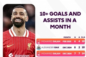 直播吧2月28日讯 英超官方盘点,萨拉赫是英超历史上仅有的多次单月联赛制造10+球的球员,而萨拉赫至今已经有3次。