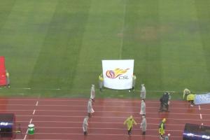 中超第2轮,青岛西海岸vs武汉三镇。比赛目前推迟15分钟,现场旗帜被吹倒。