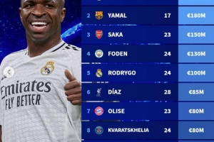直播吧4月12日讯 德转盘点了世界边锋球员身价榜,其中维尼修斯2亿欧居首,亚马尔次席,以下为具体榜单:
