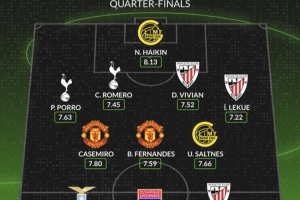 直播吧4月18日讯 欧联杯1/4决赛次回合比赛全部战罢,数据网站Whoscored盘点了本轮比赛评分最高阵容,其中切尔基领衔锋线、B费、卡塞米罗在列,具体如下: