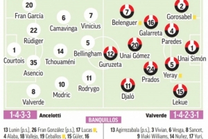 直播吧4月20日讯 北京时间明天凌晨,皇马将在西甲第32轮比赛中主场对阵毕尔巴鄂。西班牙媒体《马卡报》预测了皇马本场比赛的首发阵容,维尼修斯、贝林厄姆、罗德里戈组成三叉戟。
