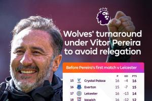 2024年12月,狼队宣布由佩雷拉接管狼队主帅的位置。佩雷拉上任后,带队取得11胜2平7负的成绩,狼队从落后保级区5分到如今领先17分提前完成保级,实现了惊人的逆袭。