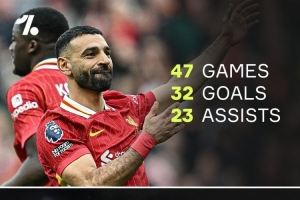 直播吧4月22日讯 据OneFootball统计,本赛季五大联赛球员中,仅萨拉赫、拉菲尼亚参与进球超过50粒。