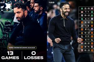 直播吧05月02日讯 欧联杯半决赛首回合,曼联客场3-0击败毕尔巴鄂竞技占得先机,阿莫林本赛季执教葡萄牙体育和曼联,共计13场欧战,取得10胜3平的不败战绩。