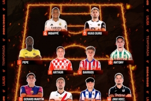 直播吧5月7日讯 西甲官方列出了第34轮比赛最佳阵容,姆巴佩、安东尼、杰拉德-马丁在列。