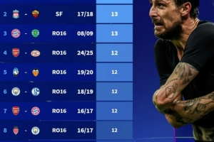 直播吧5月7日讯 在本赛季欧冠半决赛,国米与巴萨贡献2场进球大战,最终国米总比分7-6晋级。德转也盘点了欧冠改制以来单轮淘汰赛进球榜,其中国米与巴萨对决并列第一,具体如下: