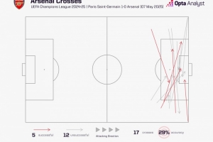 据Opta统计,阿森纳本场比赛上半场尝试17次传中,超过阿森纳本赛季欧冠全场比赛的平均传中次数(15.6次)。
