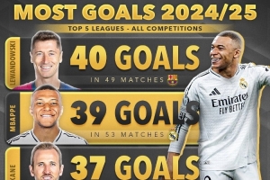 直播吧5月13日讯 媒体统计了五大联赛球员本赛季的进球数量,并列出五大联赛射手榜,莱万40球居首,姆巴佩39球次席。