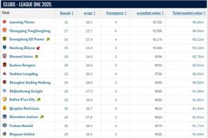 德国转会市场网(TransferMarkt.de)2025年中中甲球员身价例行更新今日已上线。