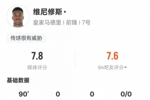 直播吧7月2日讯 世俱杯1/8决赛,皇马1-0淘汰尤文图斯。维尼修斯首发出战,2次过人成功,送出2次关键传球,但也有全场最多的18次丢失球权,评分7.8。