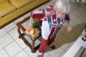 在亲属拍摄的视频中,这位身着弗鲁米嫩塞球衣的银发老人坐在椅子上,为最终比分鼓掌欢笑。