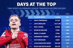 直播吧7月26日讯 《转会市场》统计了英超历任标王占据榜首的天数,新标王维尔茨刚24天。