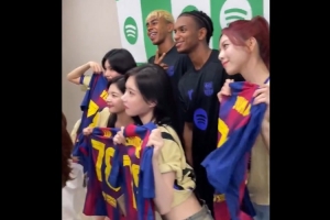 赛后,巴萨球员莱万、亚马尔、巴尔德与韩国女团ITZY进行互动。