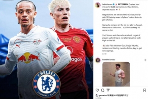 罗马诺在社交媒体上表示,加纳乔仍在切尔西的引援名单之中,但尚未展开谈判,加纳乔为他的这条动态点赞。