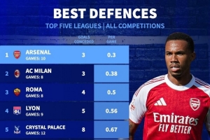 直播吧10月7日讯 德国转会市场统计了五大联赛球队本赛季的场均丢球数量,并列出场均丢球最少排名,阿森纳0.3球居首,米兰0.38球次席。
