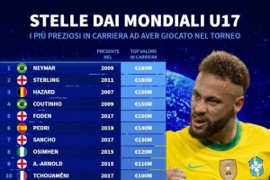 直播吧11月15日讯 德转列出了曾参加U17世界杯球员最高身价排名,内马尔1.8亿欧居首,斯特林1.6亿欧次席。