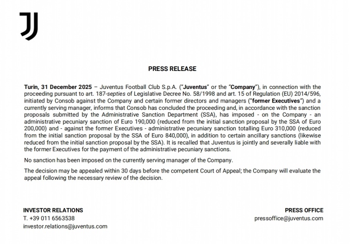 直播吧1月2日讯 尤文官方发布新闻稿,确认收到意大利监管机构意大利全国公司及证券交易委员会关于此前财务调查程序的最终裁决。