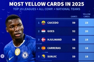 直播吧1月4日讯 2025年已经过去,《转会市场》也统计了前15联赛球员的俱乐部+国家队各项赛事总黄牌次数,凯塞多居首。