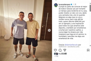 “实现了与最伟大球员见面的梦想!感谢梅西抽出时间在家中接待我,能与你交谈片刻,并将我的球衣送给你,这是我永生难忘的经历。但最重要的是,我想对你说声谢谢,感谢你成为所有热爱这项运动的人的榜样和灵感来源,也感谢你教会我们为梦想而奋斗,即使路上有再多的挫折也不要放弃。你的谦逊和朴实给我留下了深刻的人生启示。”