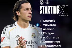 皇马首发:1-库尔图瓦、8-巴尔韦德、17-劳尔·阿森西奥、22-吕迪格、18-卡雷拉斯、6-卡马文加、14-琼阿梅尼、5-贝林厄姆、11-罗德里戈、7-维尼修斯、16-贡萨洛·加西亚