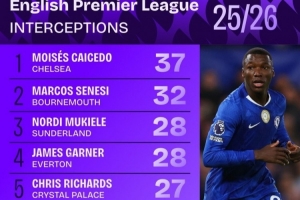 直播吧1月10日讯 squawka统计了本赛季英超成功拦截情况,凯塞多力压塞内西居首。