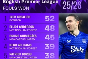 直播吧1月10日讯 数据机构squawka统计了本赛季英超的造犯规情况,格拉利什居首。