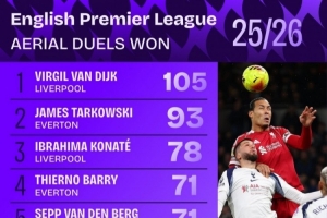 直播吧1月10日讯 Squawka统计了本赛季球员在英超成功争顶的次数,并列出榜单,范戴克105次居首,而且他77.2%的争顶成功率也是英超最高(至少尝试25次)。