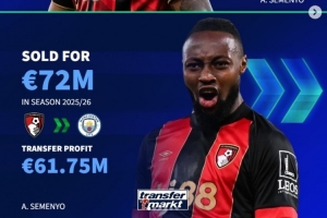直播吧1月10日讯 曼城已经官宣签下塞梅尼奥,《转会市场》统计显示这也是伯恩茅斯近年来通过转卖盈利最多的一笔交易(单位:欧元)。