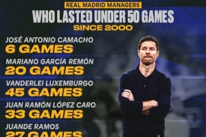 直播吧1月13日讯 皇马已经官宣解雇阿隆索,数据统计显示,他也是新世纪皇马第10位执教未达50场的正式主帅。