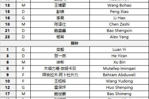 16-李昊、2-胡荷韬、3-贺一然、4-吾米提江、15-彭啸、23-杨希、6-徐彬、20-李镇全、8-木塔力甫、9-拜合拉木、10-王钰栋