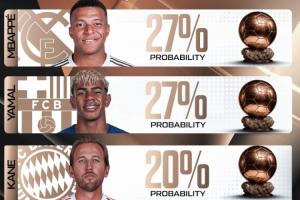 直播吧02月04日讯 相关机构近期更新了2026年金球奖的获奖概率预测,目前姆巴佩与亚马尔并列领跑,两人获奖概率均为27%,凯恩和哈兰德则紧随其后。