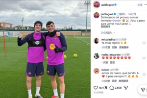 直播吧2月4日讯 不久前,巴萨中场加维更新社交媒体,晒出了与佩德里一起进行恢复性训练的合照。