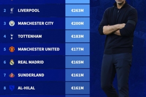 直播吧2月5日讯 本赛季五大联赛冬窗结束,德转统计了本赛季净支出最高的球队排行榜。