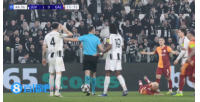 “红牌判罚,严重犯规。尤文图斯6号球员用鞋钉与对方球员的左脚踝发生严重不当接触,威胁到了对方球员的安全。”
