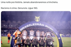 在本轮巴甲联赛中,科林蒂安1-1战平克鲁塞罗,球队在最后时刻扳平比分。科林蒂安官推配文写道:“足以载入历史的一个夜晚,我们从不放弃。种族歧视是犯罪行为,如有请大家举报。”