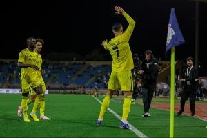 直播吧02月26日讯 沙特联第10轮补赛,利雅得胜利客场5-0大胜纳杰马体育,C罗传射建功,他破门后做出新的庆祝动作,类似篮球的盖帽/投篮姿势。