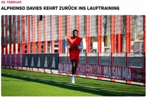 直播吧2月26日讯 拜仁官网发文,确认边后卫阿方索·戴维斯恢复跑步训练。